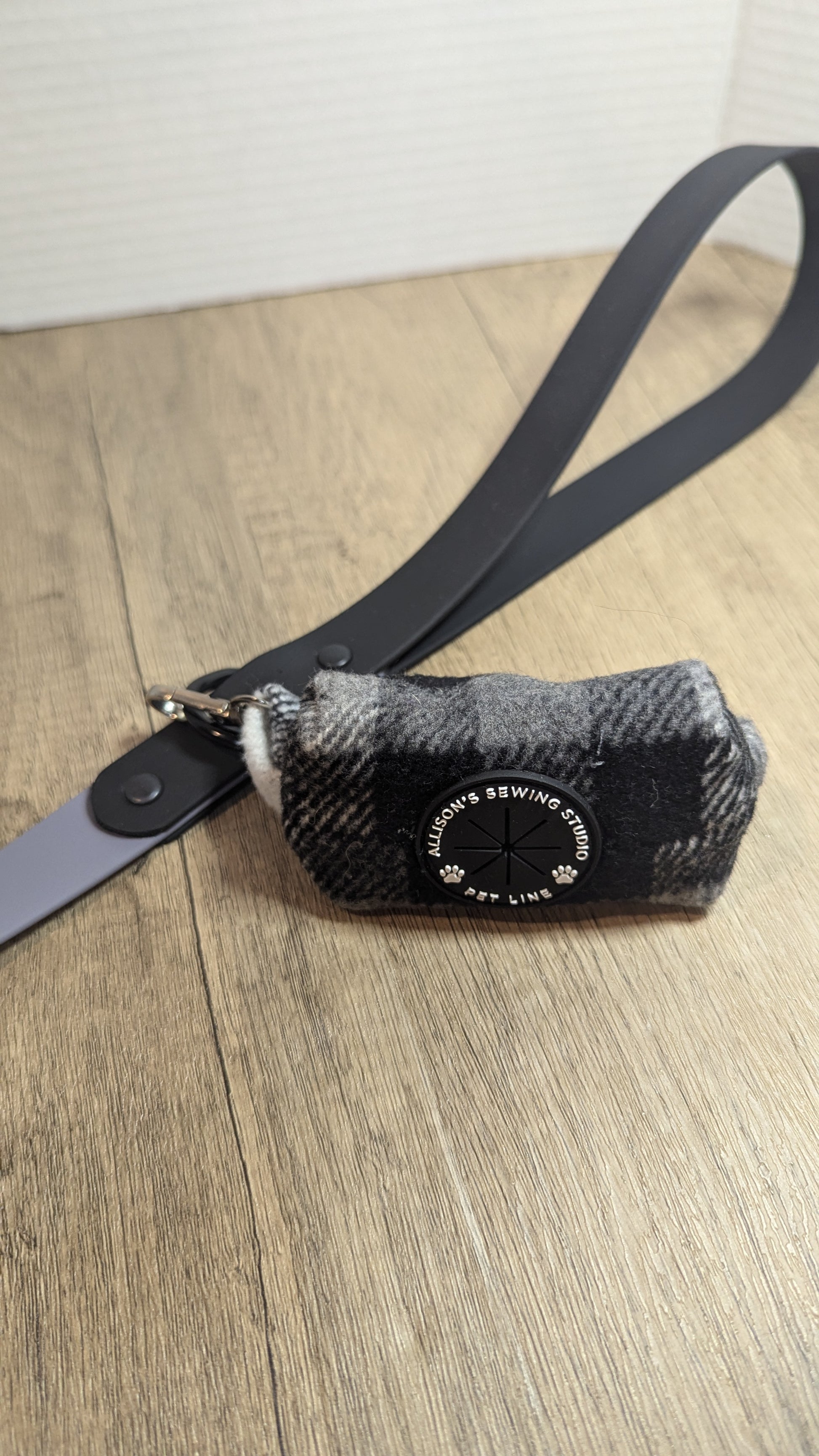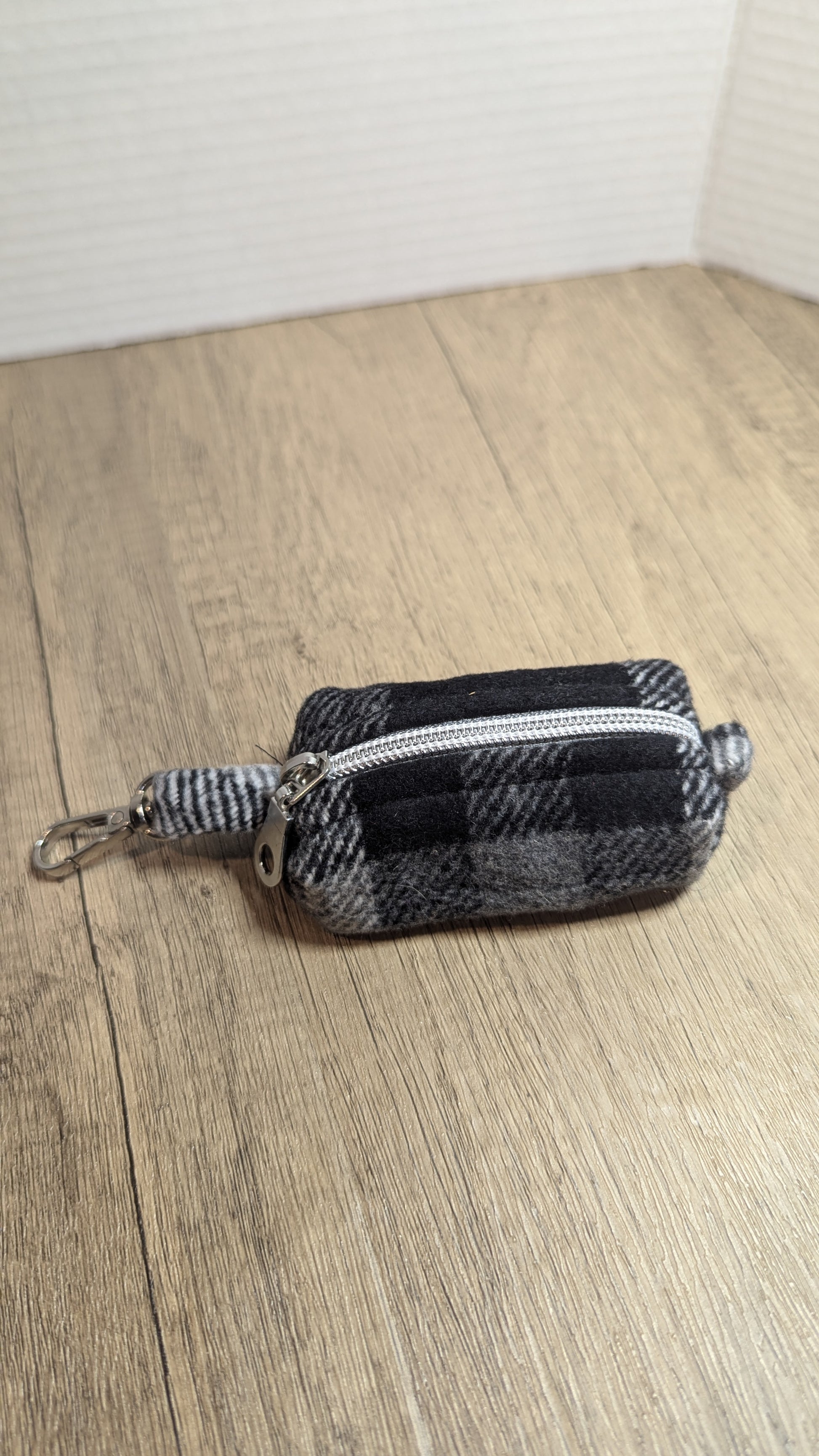 This poop bag holder is lightweight and made of wool blend and polyester cotton blend fabric lining.