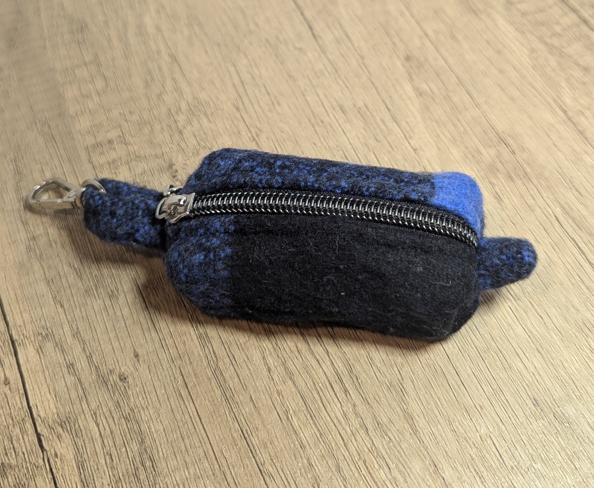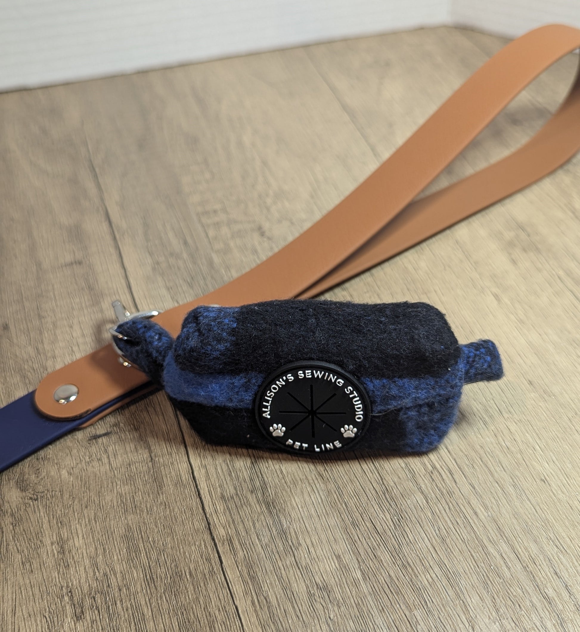 This poop bag holder is lightweight and made of wool blend and polyester cotton blend fabric lining.