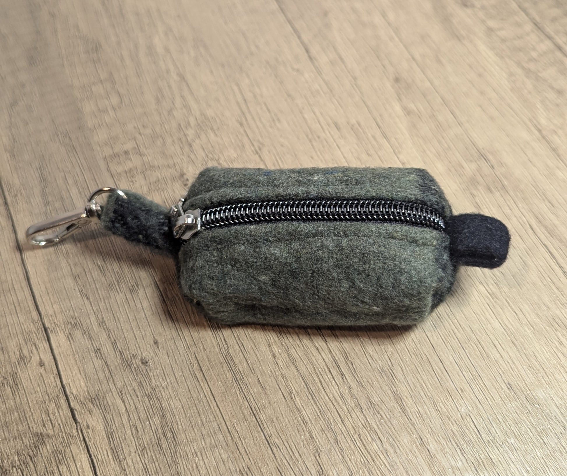 This poop bag holder is lightweight and made of wool blend and polyester cotton blend fabric lining.