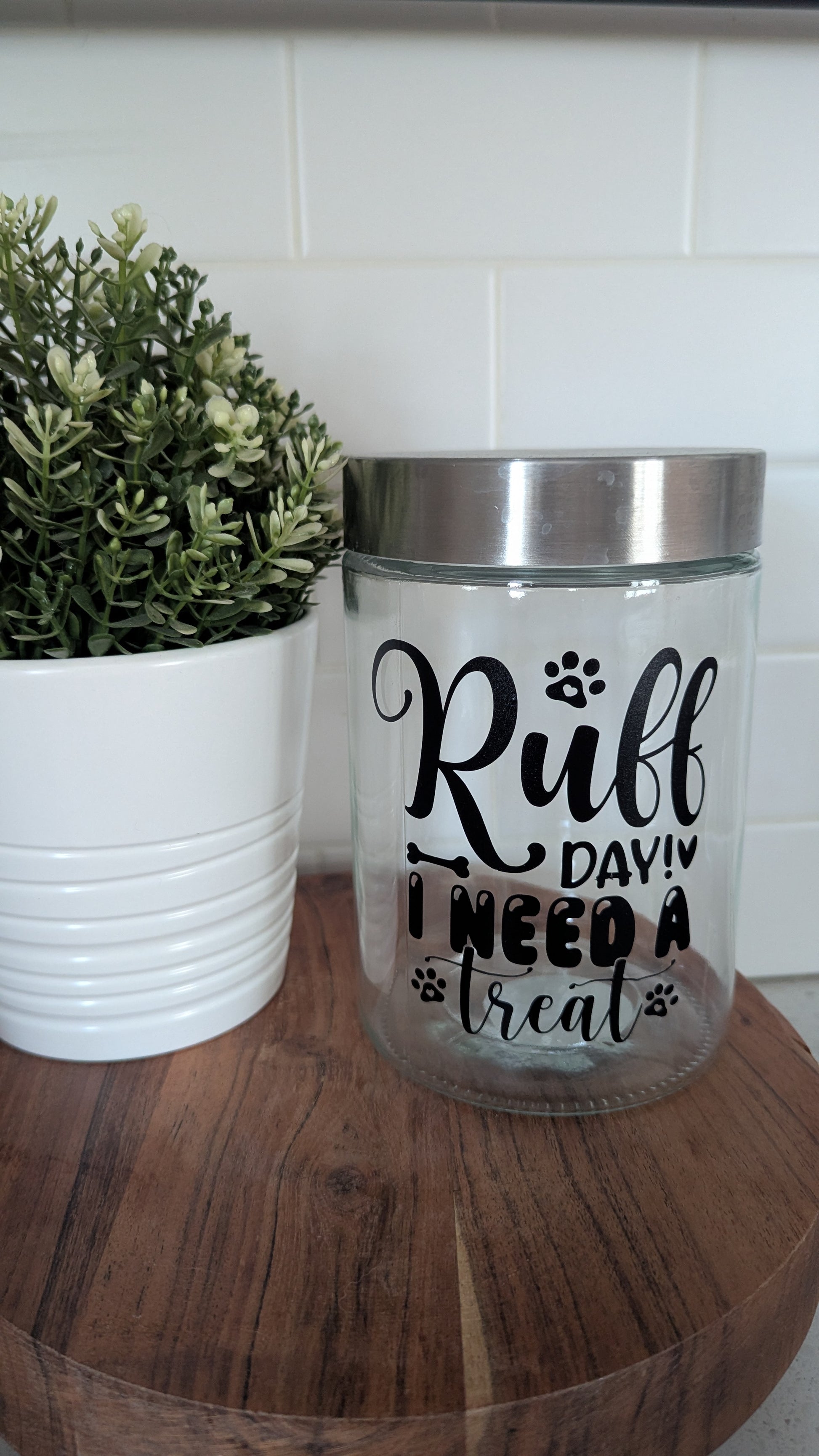 Keep your furry friend's snacks fresh and fabulous in this adorable glass treat container! With a secure lid and generous 6.5" height by 14" diameter capacity, there's plenty of space for all those tail-wagging rewards. The transparent design lets you see when it's time for a refill—and your pup will love watching their favorite treats waiting inside!